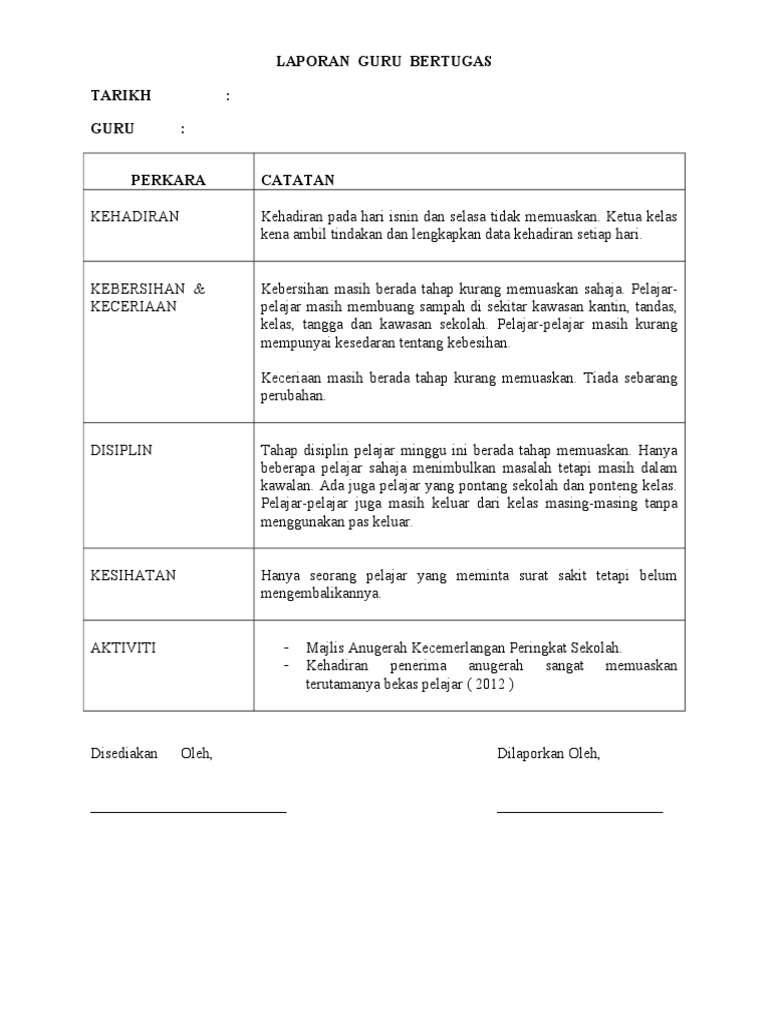 Read and listen offline with any device. Persekolahan ke dalam Buku Laporan Bertugas antara perkara-perkara yang perlu. Nama guru tidak hadir laporan ketua guru bertugas keputusan pertandingan kelas tahap 1.